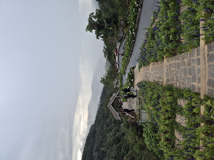 A stone-paved path descends, lined with green plants and purple flowers. A covered pavilion is seen with people on its deck. The path continues into a garden area. Beyond the garden lies a mountain range obscured by a misty, cloudy sky. Lush green trees cover the mountain slopes below.