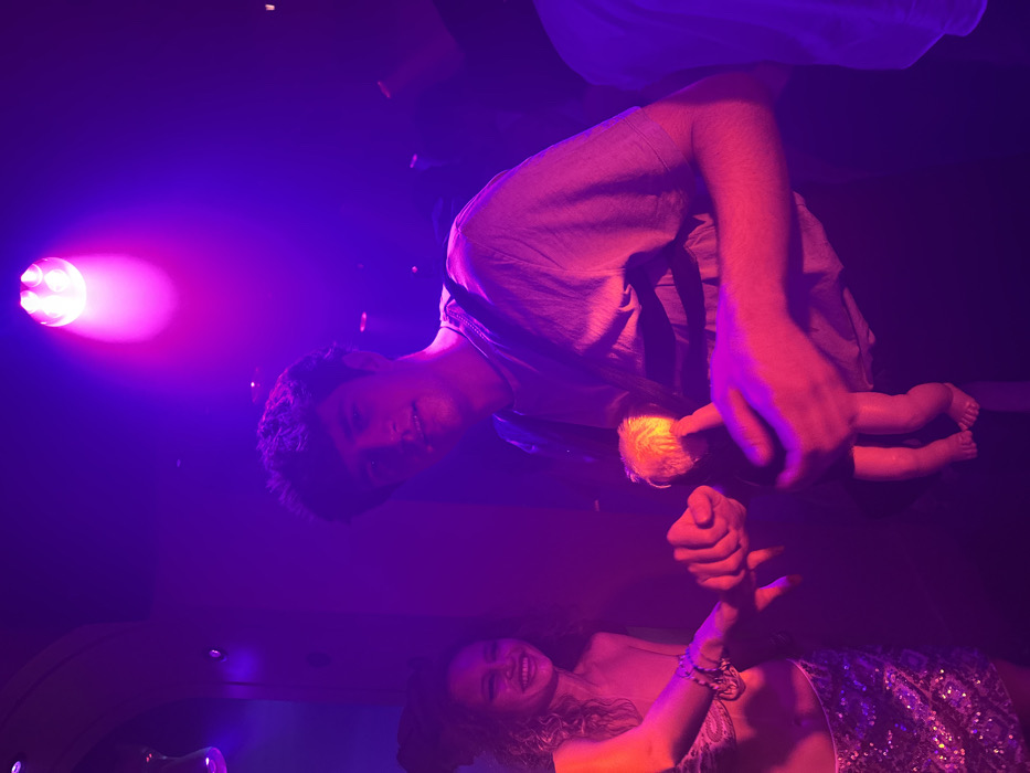A purple-hued, upside-down image shows a man with dark hair wearing a t-shirt, holding a doll above a woman