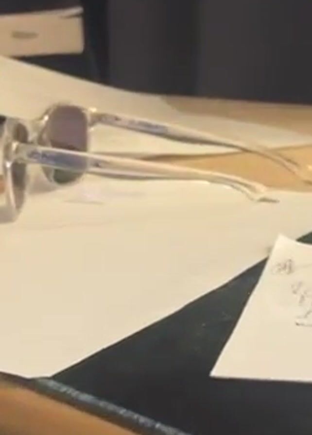 desk with various objects on it. There is a pair of O'Neill sunglasses lying on top of some papers. A mug with white polka dots is also visible. A black pen lies on top of another set of papers. A keyboard and desk lamp are partially visible in the background. The desk is made of light wood. The background also includes dark curtains.
