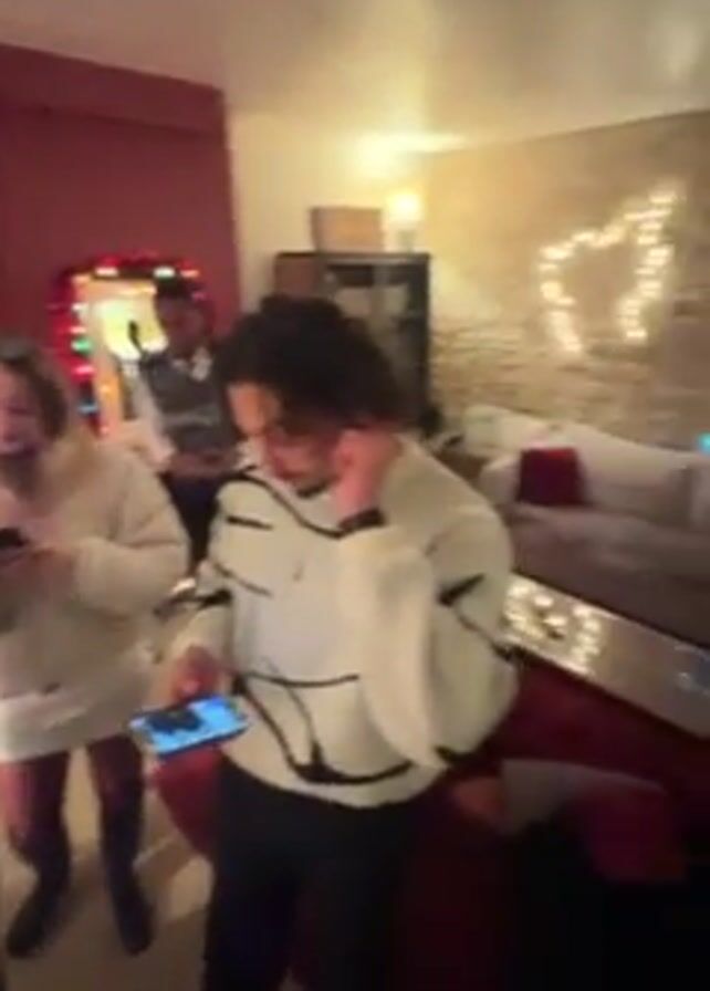 n interior scene of a house party with festive decorations. The first shot features three individuals: a woman in a black outfit holding a drink, a woman in a white dress using a phone, and a man in a patterned sweater also looking at his phone. They are standing in a room with a red accent wall adorned with a mirror and Christmas lights. The camera then pans to reveal another room with a white couch, string lights on the wall, and a group of men playing pool. The individuals are socializing and casually interacting within the house party setting.