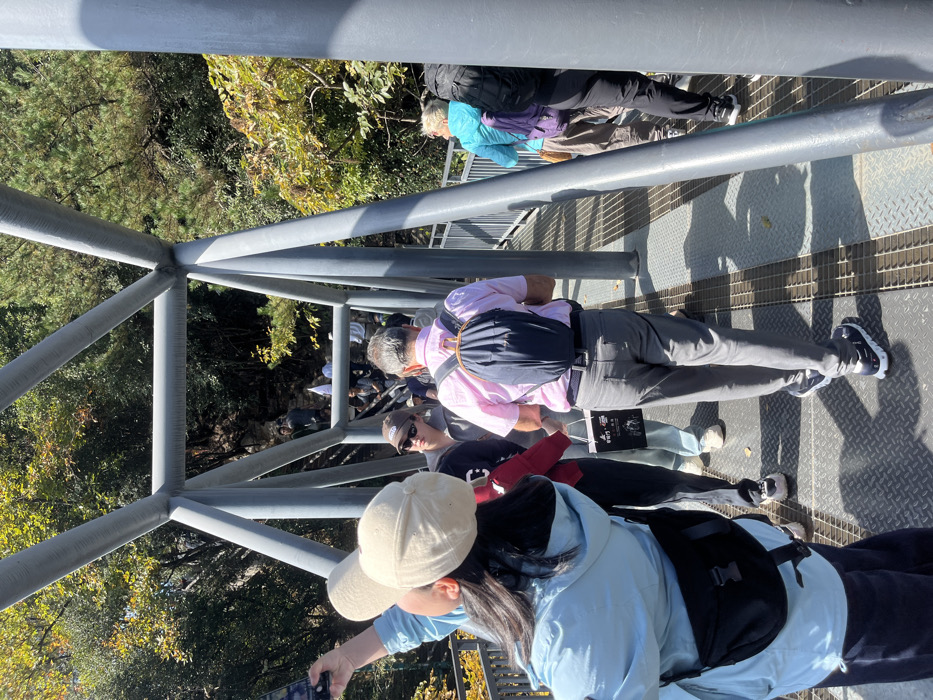 People walk along a metal platform enclosed by a gray metal frame. Trees are visible below the platform. A woman in a light blue jacket and beige cap takes a photo. Other people include one in a pink shirt with a dark blue backpack, a woman in sunglasses and a red sleeve, and an older person in a blue jacket. Shadows are cast on the metal floor.