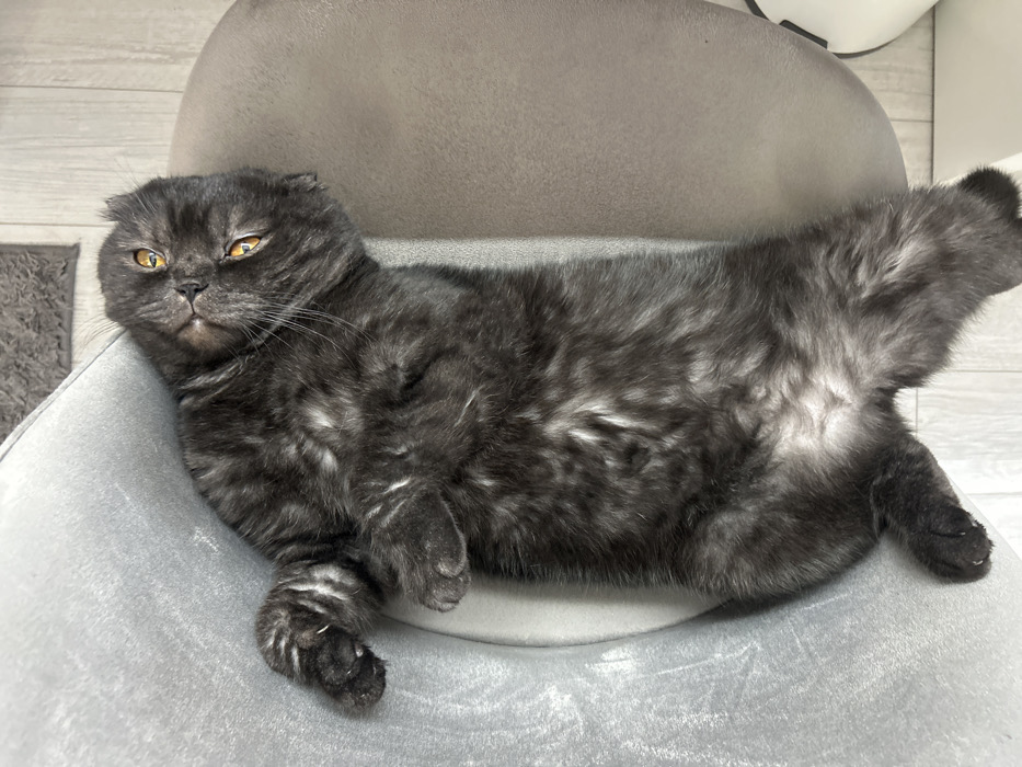 - "A dark gray Scottish Fold cat with distinctive silvery-white tabby markings is depicted lying on its back on a light gray upholstered surface, exposing its belly" by FM-Wzjle2, licensed under CC BY 4.0