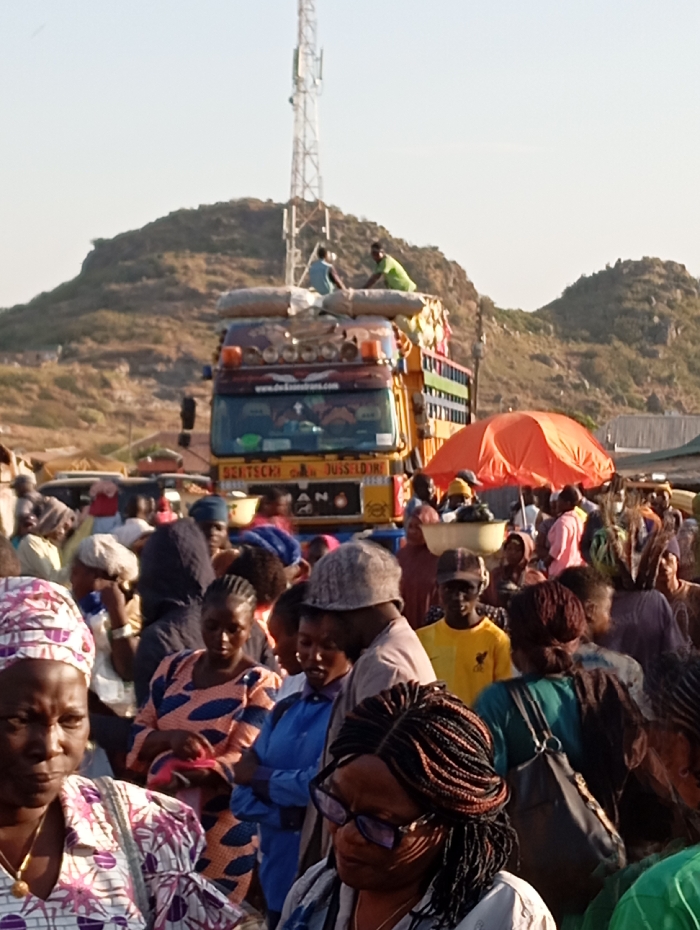 This image depicts a densely crowded outdoor market scene in Jos, Nigeria, under a clear sky. In the background, rolling, arid hills are visible, topped by a tall, lattice-structure communication tower on the highest peak. A large, multi-colored cargo truck, primarily yellow and orange with blue accents, occupies the central midground. It is heavily loaded with numerous large, light-colored sacks stacked high on its flatbed and roof. Two men are seated on top of the cargo on the truck's roof; one wears a light blue top, the other a bright green top. The truck's cab features multiple auxiliary lights and a decorative sun visor. The foreground and midground are filled with a multitude of individuals, primarily adults, moving through or standing in the market. Many women wear patterned headwraps or head coverings. In the far left foreground, a woman wears a white and pink patterned headwrap and dress. In the central foreground, another woman with glasses and braided hair (black and reddish-brown) looks downwards. Clothing styles vary, including traditional patterns and contemporary items, such as a yellow t-shirt with a visible "LFC" logo worn by a young man in the midground. An open orange umbrella provides shade amidst the crowd on the right side of the truck. A faint sign with text including "SEITSCHKI CAN DUSSELDORF" is visible in the background, above the crowd. The overall scene indicates a busy commercial or gathering area.