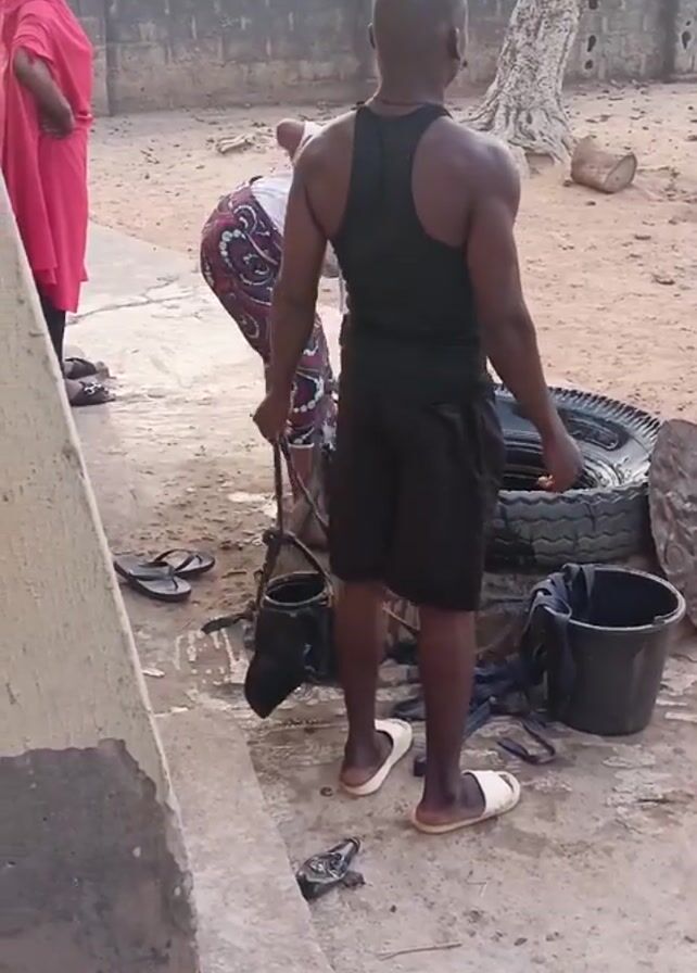 The scene is an outdoor courtyard area, presumably in a village or rural setting. The ground appears to be a mixture of dirt and concrete. A man wearing a black tank top and black shorts stands facing away from the camera. He is wearing light-colored sandals. Near him is a pile of items including a tire, a black bucket, and what appears to be tools or items related to vehicle maintenance. To the left of the man, another person is bent over, appearing to be working on something near the ground, possibly related to the items around them. A woman in a red hijab is standing to the left, and another person is partially visible in the background. The scene seems to depict a casual outdoor work or maintenance activity.