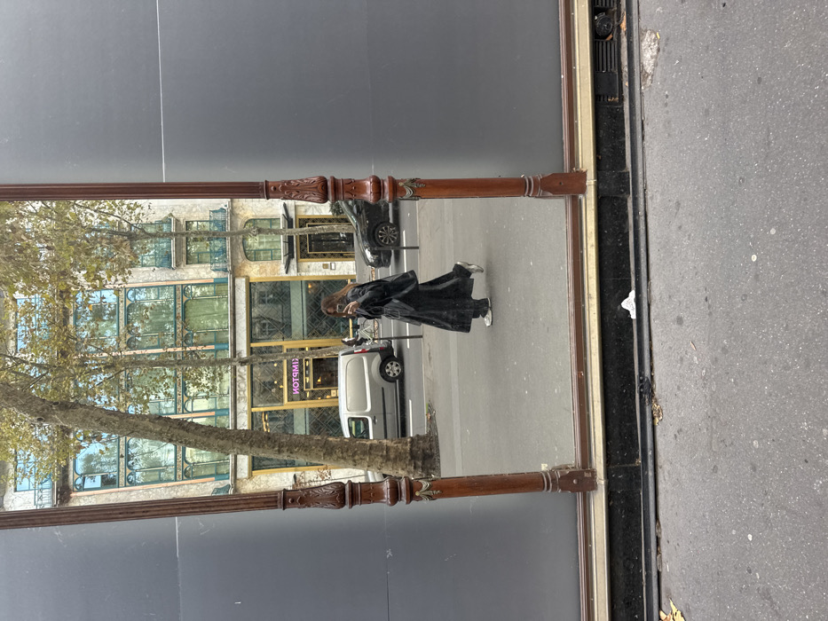 The image depicts a street scene in Paris, France, captured as a reflection in a large, ornate mirror or shop window. The location is Boulevard des Capucines, facing the Kimpton St Honoré Paris hotel, identifiable by the reversed "KIMPTON" neon sign on its facade. In the foreground, a dark wooden frame with carved details borders the reflective surface. Below the frame, a black ledge transitions to a grey asphalt sidewalk littered with scattered autumn leaves and a crumpled white paper item. A solid grey, non-reflective panel occupies the right section of the mirror frame. The reflection shows an individual, appearing female, walking left to right on a grey asphalt street. She is dressed in a long, dark, full-length coat or dress and light-colored athletic shoes. Her right hand is raised, holding a dark-colored smartphone, indicative of self-photography. Behind her, parked vehicles include a silver cargo van on the left and a dark SUV on the right. The background features the multi-story Kimpton St Honoré Paris hotel, characterized by its ornate architecture, including distinctive teal-framed windows and balconies with intricate ironwork. The hotel's reversed "KIMPTON" sign, illuminated in magenta, is prominent on the ground floor. Deciduous trees with sparse, autumn foliage line the reflected sidewalk in front of the hotel. The sky is overcast, indicating daytime conditions.