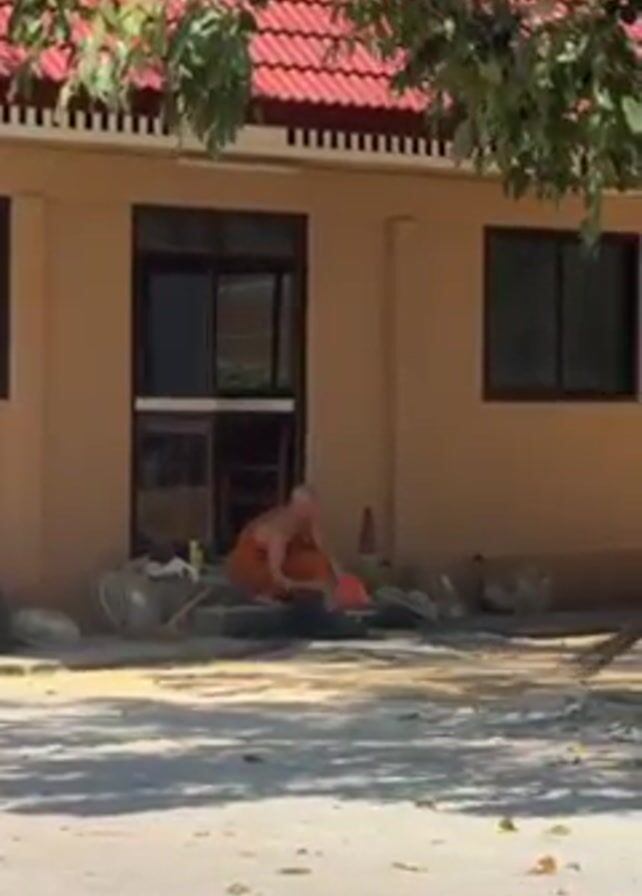 A medium shot shows two Buddhist monks in orange robes outside a tan building with a red tiled roof