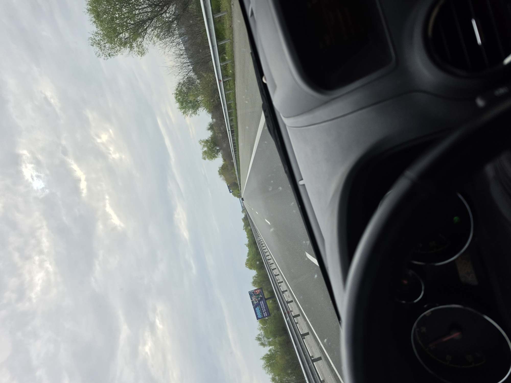 The image depicts a view from inside a vehicle traveling on a highway near Kaloyanovets, Bulgaria. A portion of the dashboard and steering wheel are visible in the foreground. The highway has multiple lanes with a barrier. Trees and vegetation line the side of the road. A billboard is visible along the roadside. The sky is overcast with clouds.