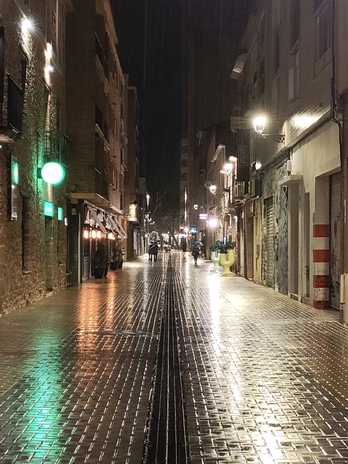 - "The image depicts a narrow urban street in Dénia, Spain, at night, under wet conditions" by FM-BilZA3, licensed under CC BY 4.0