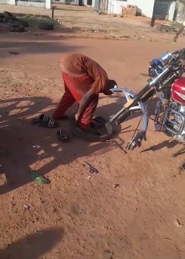 A man in a brown shirt and red pants is repairing a motorcycle tire on a red dirt lot