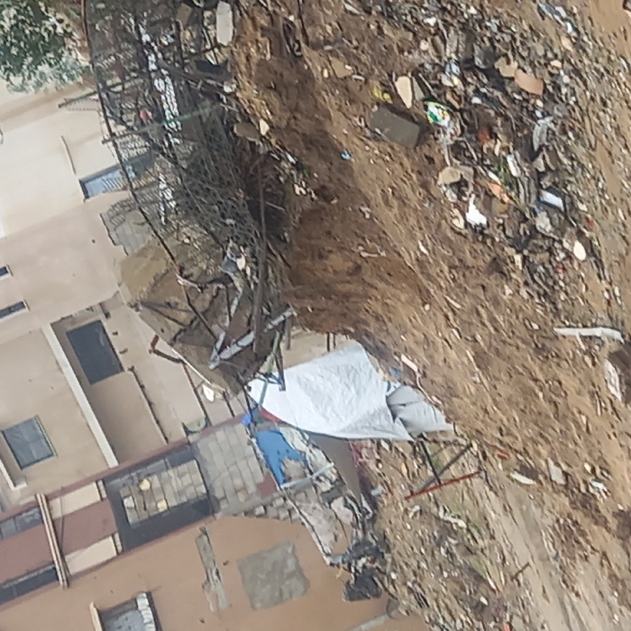 This image depicts a scene of widespread urban devastation in Khan Yunis, Palestinian Territory. The foreground and midground are dominated by uneven terrain consisting of light brown, loose soil mixed with extensive construction debris. This debris includes concrete fragments, twisted rebar, shattered blocks, and miscellaneous household items, indicative of recent structural collapse or demolition. A prominent, large white tarp or sheet is draped over a mound of rubble in the midground, forming a makeshift covering or shelter. Adjacent to this, a substantial mass of tangled metal and concrete, consistent with a collapsed building section, lies on the ground. In the background, multiple multi-story buildings show significant damage; one on the left has a partially absent facade revealing internal structural elements, while others appear compromised. The environment is barren of significant vegetation, and no individuals are visible.