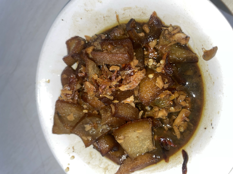 A white bowl is filled with a dish featuring dark, cubed pieces, possibly eggplant, in a glossy, dark sauce. Sprinkled on top are fried shallots or garlic. The sauce appears to contain chili flakes or seeds. Some of the liquid has spilled on the side of the bowl. The background is a plain white surface.