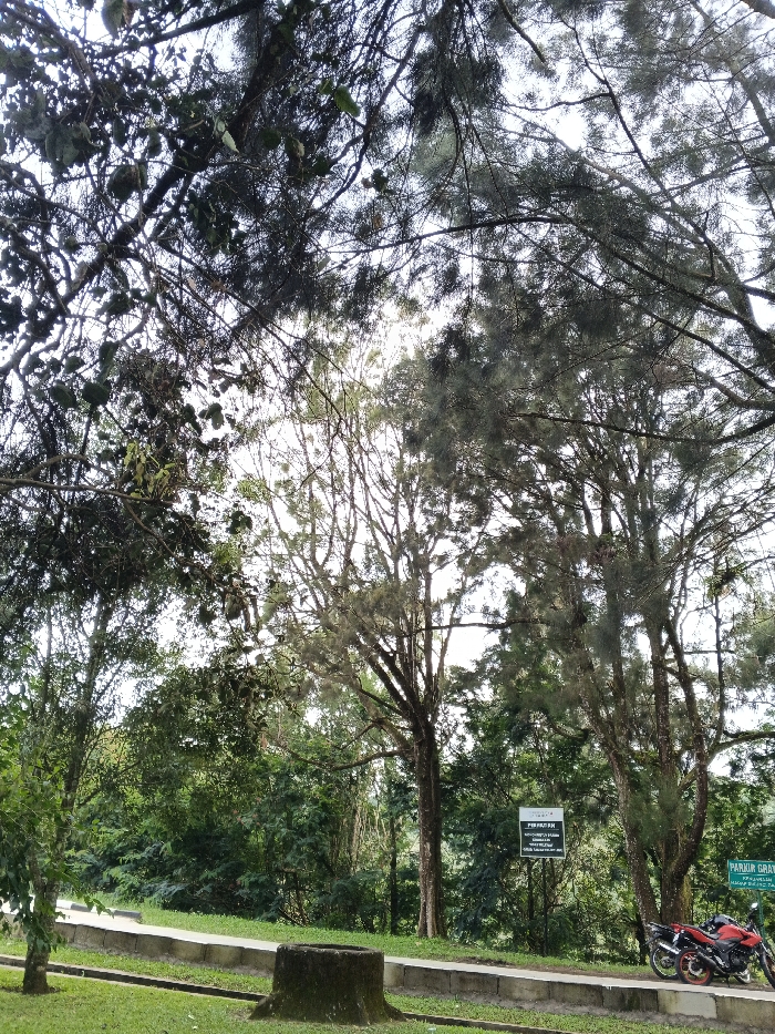 The scene depicts a natural, heavily treed outdoor area within the city of Masulog, Philippines. In the foreground, a section of green grass is present. A dark, weathered tree stump, approximately 30-40 centimeters in height and diameter, sits on the grass in the lower-left quadrant. A light gray concrete curb separates the grass from a paved path or road that runs horizontally across the mid-ground, gently curving upwards towards the right. Two motorcycles are parked on this paved surface on the right side of the image; one is primarily red and black with an orange accent on its front wheel, while a darker motorcycle is partially obscured behind it. In the middle ground, situated amidst the trees and adjacent to the paved area, a white rectangular sign with black text is mounted, prominently displaying "PERHATIAN" at its top, followed by additional text that appears to be regulations or information. To the far right, a green rectangular sign with white text is partially visible, showing "PARKIR GRATIS". The background is dominated by a dense arrangement of tall trees with varying foliage, some exhibiting needle-like leaves and others broader leaf patterns. The sky, bright and predominantly white-gray, is visible through the intricate network of branches and leaves forming the tree canopy overhead. No individuals are present in the image.