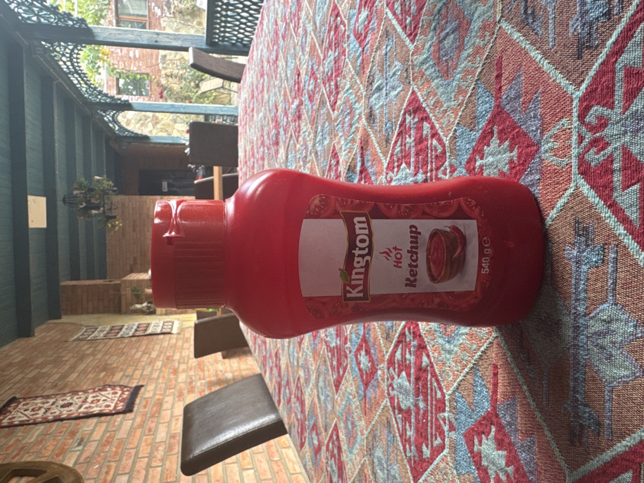 - "A red plastic squeeze bottle of "Kingtom Hot Ketchup," weighing 540g and featuring a white label with product branding and a chili pepper illustration, is centrally positioned on a patterned textile tablecloth" by FM-EU4xB3, licensed under CC BY 4.0