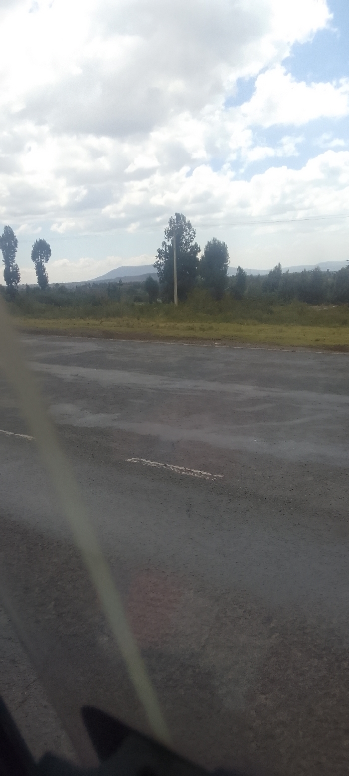 The image depicts a static outdoor scene located in Hells Gate ward, Kenya, under an overcast sky with visible patches of blue. The foreground features a dark gray asphalt road surface with a faint, broken white lane marker. A diagonal light-colored linear obstruction traverses the lower left quadrant of the image, with a dark shadow occupying the bottom-left corner. Beyond the road, a strip of sparse green and brown vegetation separates the road from a denser line of trees in the midground. These trees are tall and slender with dark foliage. A utility pole, likely constructed of wood or concrete, stands prominently among the trees on the right side, supporting visible overhead lines. In the distant background, a hazy mountain range or prominent hills are visible beneath the cloudy horizon. No individuals, animals, or active subjects are present in the scene.