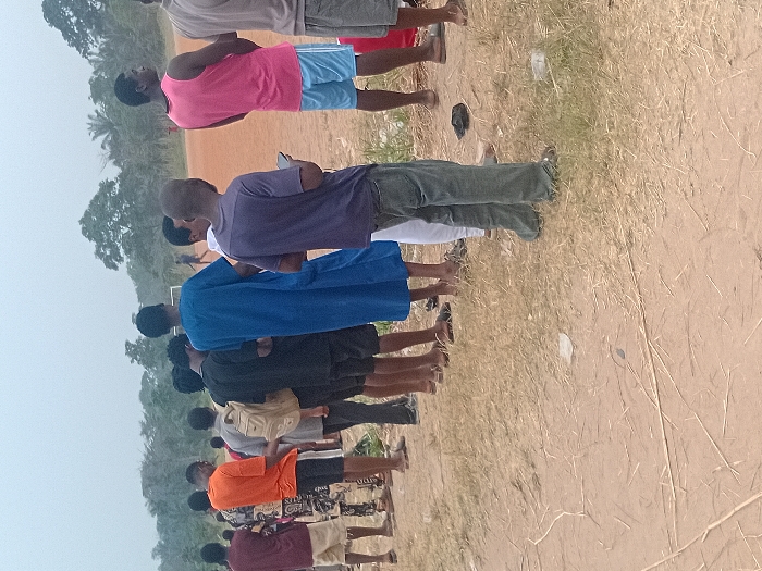 A line of people stand on dirt and grass, mostly facing away from the camera. They wear various casual clothes, including an orange shirt, a blue robe-like garment, and gray pants. Some are barefoot, while others wear sandals or shoes. Trees are visible in the background under a cloudy sky.