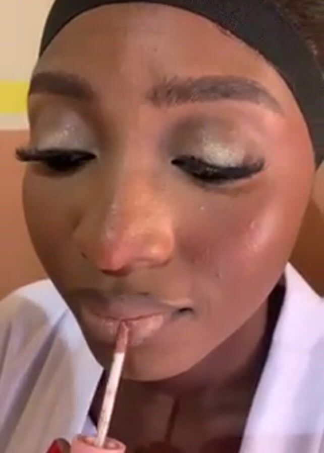 A medium close-up shows a woman with dark skin applying lip gloss to her lower lip