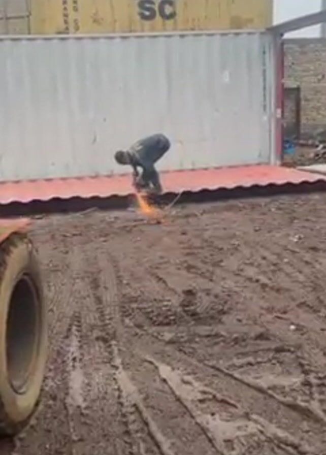 In a slightly overexposed medium shot, a person in a dark-colored jacket is bending over and using a cutting tool on the bottom edge of a white storage container with a red frame. Sparks are flying as they work. To the left of the person is an orange and gray forklift with visible tire tracks in the muddy ground. Behind the white container is a yellow container with the letters “MSC” in a black logo. The ground is muddy with tire tracks. The sky is overcast, and the overall environment suggests an industrial or storage yard.