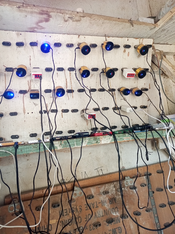 In Zango, Nigeria, a vertical off-white wooden panel functions as a multi-device charging station within an indoor environment. The panel is fitted with a grid of black rectangular clips. Embedded into these clips are approximately ten cylindrical car-charger-style USB adapters, many of which emit a blue illumination, indicating active power. Several white and one pink multi-port USB wall chargers are also integrated into the panel, with some displaying red digital current readings, such as "0.0 A" or "0.00 A." Numerous black and white USB charging cables extend downwards from these adapters. Below the main panel, a weathered, green-painted wooden ledge supports multiple mobile phones and small electronic devices actively connected to the charging cables. Further below, a second, lighter wooden surface with stenciled text including "AIR IN-TAKE SYSTEM" and "COUNTRY OF ORIGIN" is visible, along with additional black rectangular clips. No individuals are present in the scene. The setup appears to be a functional, utilitarian charging hub.
