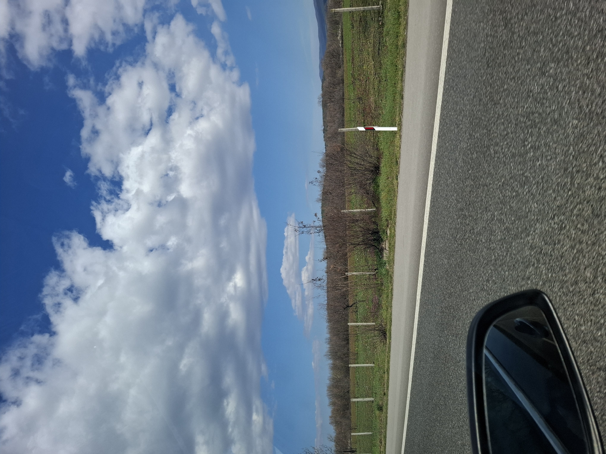 view from a moving vehicle on a road near Kalugerovo, Bulgaria. The road is asphalt and has a white line marking the edge. To the side of the road, there is a grassy area with a series of wooden posts and bare trees. Beyond that is a field. The sky is blue with white clouds. The rearview mirror of the vehicle is visible in the corner of the image.