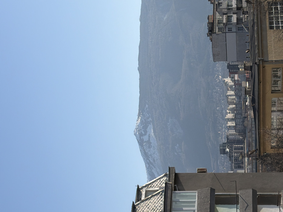 The image displays a panoramic view of an urban area in Sofia, Bulgaria, with Vitosha Mountain prominently situated in the background. The sky is clear and bright blue, devoid of clouds. In the background, Vitosha Mountain rises, its upper slopes and peak (likely Cherni Vrah) covered with distinct patches of snow. The mountain's lower and mid-slopes are covered in dense, dark vegetation, indicating forested areas, and appear hazy due to atmospheric conditions. The mid-ground reveals a sprawling urban landscape, characteristic of Sofia. Numerous multi-story buildings, primarily residential blocks of varying architectural styles and ages, are tightly packed. Their facades display a range of colors, including grey, white, and light beige. No specific distinguishing landmarks are clear within this dense urban cluster, but the overall layout is that of a bustling city. In the immediate foreground, two buildings partially frame the scene. On the left, a multi-story residential building with a dark grey facade features a prominent mansard roof covered in light grey or white tiles. A dormer window is visible on this roof. Below, a bay window or balcony structure is present, and a rectangular external unit, possibly an air conditioning condenser, is mounted on the building's side. On the right, partially visible, is a lower, light-colored building with a flat, dark roof and multiple rectangular windows. Bare tree branches are discernible in front of this building. No individuals, animals, or specific actions are depicted within the frame. The scene is illuminated by strong daylight, suggesting a clear day during winter or early spring, given the snow on Vitosha Mountain and the bare trees in the foreground.