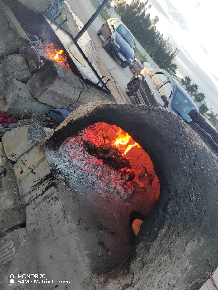 A weathered outdoor oven, likely made of clay or concrete, glows with intense heat from a wood fire within. Flames dance amidst burning logs and smoldering embers, creating a vibrant, fiery display. Beside the oven, a large flat griddle rests on a makeshift stove fueled by fire, possibly for cooking food. In the background, cars are parked along a roadside, suggesting a roadside cooking operation. The scene has an earthy, rustic feel, highlighting the traditional cooking methods used.
