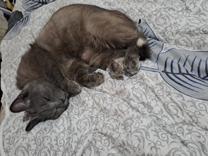A gray, medium-haired domestic cat is observed sleeping curled up on a bed