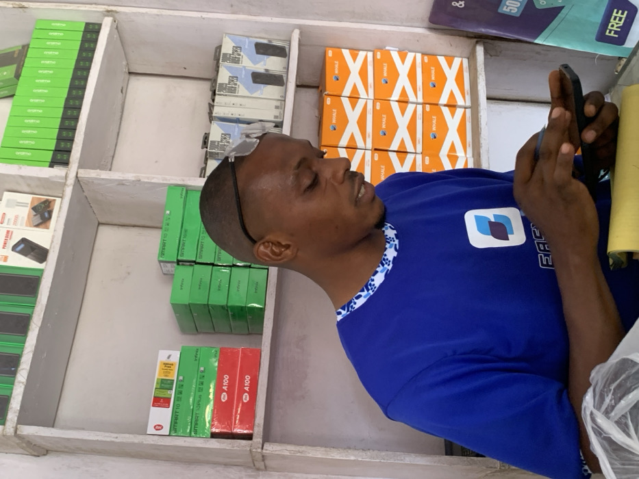 A dark-complexioned male individual with short hair and clear glasses resting on his forehead is depicted in Fagge A, Nigeria. He wears a blue t-shirt featuring a white and blue patterned collar and an "Easy" logo on the chest. The man is looking downwards, actively manipulating a black smartphone with both hands, using his right thumb to interact with the screen. The background reveals white wooden shelving stocked with various packaged electronic items. Visible objects include stacks of green boxes labeled "Infinix SMART 10" and "SMART 10 Plus," red "A100" boxes, white boxes indicating "20000 mAh High Speed" power banks, and orange boxes branded with "WHALE." A partial promotional sign showing "50%" and "FREE" is visible on the right side of the frame, suggesting a retail environment for electronics or mobile phones.
