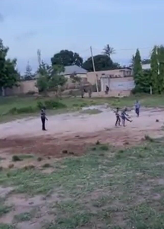 several children playing soccer on a sandy field. Buildings and trees border the field. The sky is overcast. The children are kicking and running after a soccer ball. At least five children are visible in the frame. The quality of the video is somewhat grainy.