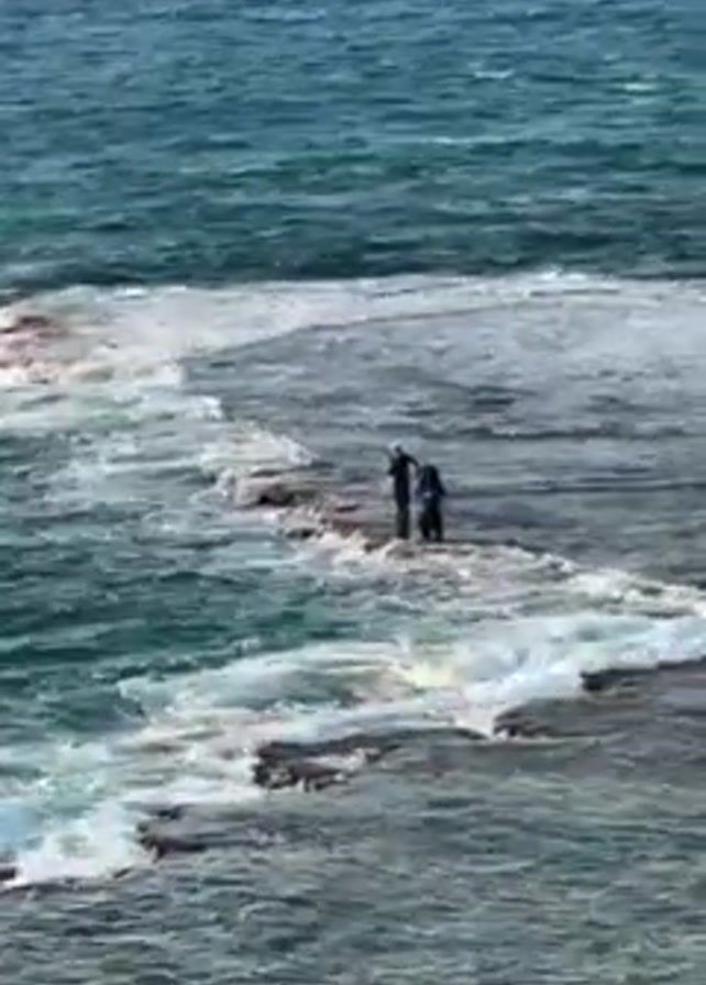 Two people stand on a rocky outcrop in the ocean. Waves crash around them. The water is a deep teal color. The sky is a pale blue.