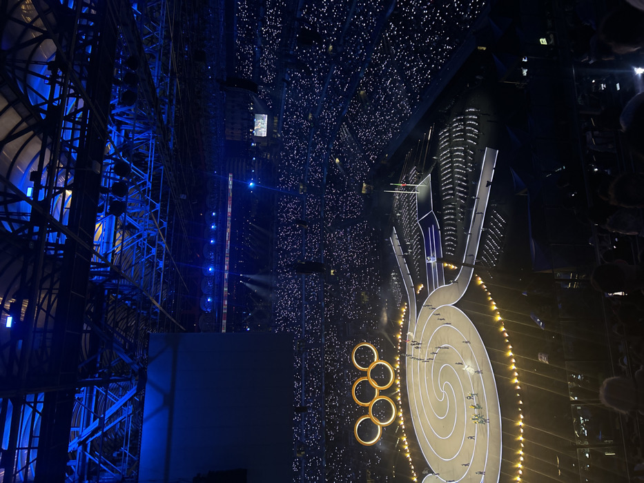 An indoor arena with a stage illuminated by bright lights. A spiral-shaped ramp encircles the stage, decorated with golden rings. A towering screen and a complex network of blue-lit structural support beams frame the view. The audience section is visible, filled with numerous bright points, presumably handheld lights held by spectators. The image is rotated, presenting an unconventional perspective.
