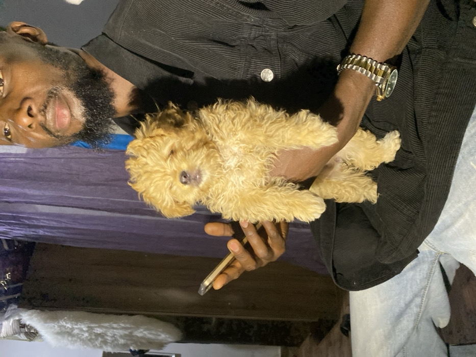 In Barakin Akawo, Nigeria, an indoor scene depicts an adult male holding a small, light brown, curly-haired puppy directly in front of him