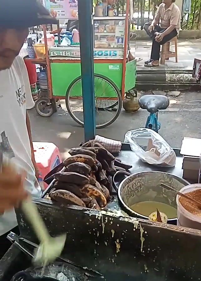 A man in a white t-shirt and black baseball cap is preparing food at a street vendor stall. He is seen taking cooked bananas from a pile and preparing them to be cooked in a flat pan. Next to the pan, there is a container of batter and a covered container of topping. The stall is green and has a menu with descriptions of various drinks. Behind the vendor's stall, another man is sitting on a chair. The stall is set up on a paved area next to some trees, possibly a park. There is a bicycle wheel as part of the construction of the stall. Other people walk by in the background.