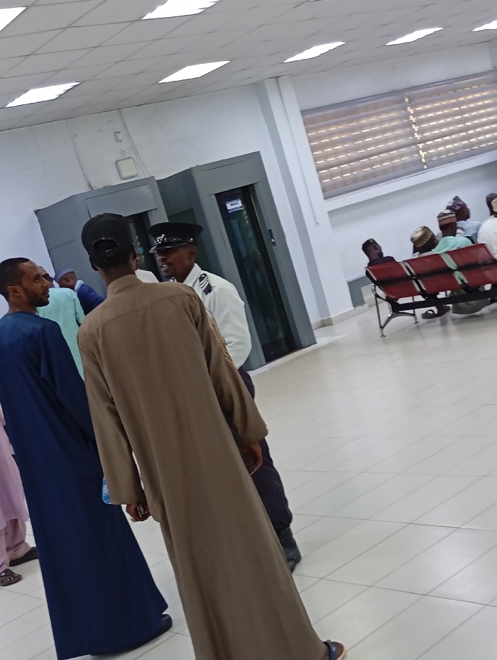 The image displays an indoor scene within a modern public facility in Zaria, Nigeria. In the foreground, three male individuals are positioned. A man, viewed from the back, wears a dark baseball cap and a light brown, ankle-length robe, holding a small dark object in his right hand. To his left, another man, seen partially from the side, wears a dark blue, ankle-length robe and has a beard. He is looking towards the center of the frame. Facing these two individuals is a uniformed male officer, likely a police or security personnel, dressed in a white shirt with epaulets, dark trousers, and a dark peaked cap with an emblem. He has a mustache and a light beard, and his mouth is open, suggesting he is speaking or smiling. Behind the uniformed officer, two dark, vertical structures, consistent with elevator doors, are visible; one features a white sign with "NOTICE" printed on it. The floor is constructed of light-colored, square tiles arranged in a diagonal pattern. The walls are white, and the ceiling is a false grid with multiple recessed square LED light panels. In the mid-ground to the right, several other male individuals are seated on a red-and-silver public waiting bench. These individuals wear traditional Nigerian attire, including various caps, and are positioned against a white wall featuring horizontal blinds covering a window. The scene depicts an interaction between citizens and a uniformed officer within a public waiting or administrative area, characteristic of a government building, a large institution like a university, or a transportation hub in Zaria.