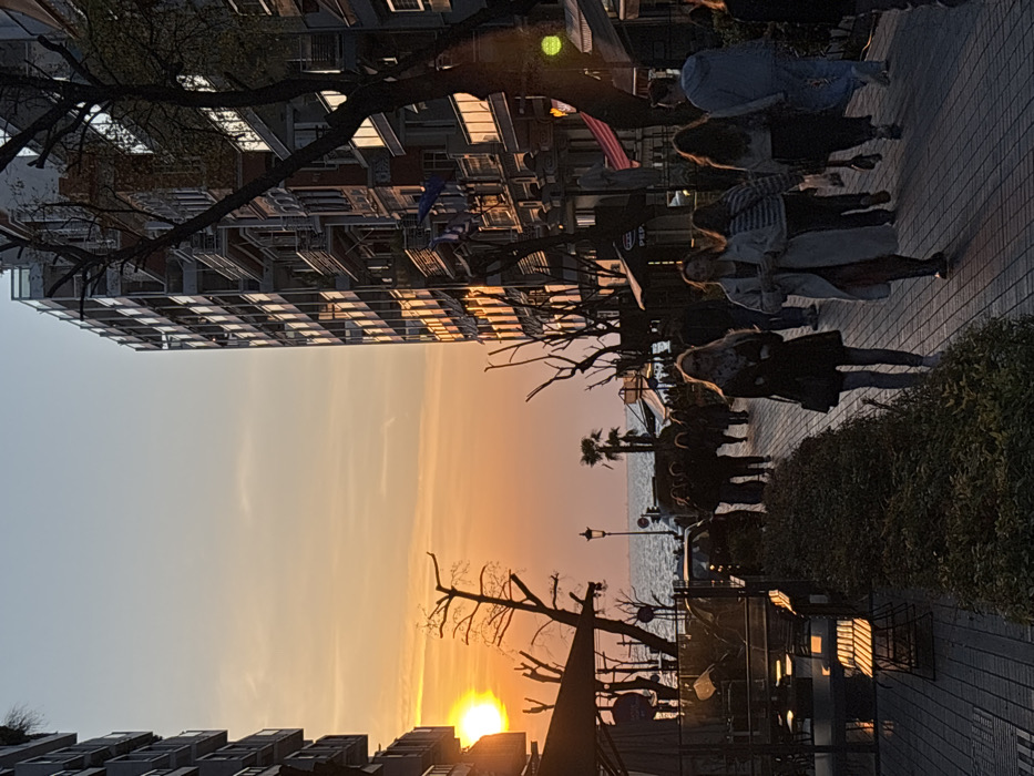 The image presents a detailed view of a pedestrian promenade along the Thermaic Gulf in the Thessaloniki Municipal Unit, Greece, at sunset. The sun, a brilliant orange-yellow sphere, is positioned low on the horizon on the far left, creating a luminous glow that extends across the sky, fading from orange to a light blue at the zenith. The sea surface is dark blue, meeting the horizon line in the distance. On the left side, a multi-story building with balconies is partially obscured by a dark awning covering an outdoor cafe area, where tables and chairs are arranged. A dark-colored sedan or small SUV is parked nearby. Bare-branched deciduous trees are silhouetted against the bright sky on this side. On the right, a series of multi-story buildings stands prominently. The nearest building displays a modern upper structure with balconies, while its lower facade is more ornate, featuring arched windows and decorative elements. A Greek flag is affixed to this building. The building exteriors reflect the golden light of the setting sun. Further along the promenade on the right, other commercial establishments are visible, some with awnings and illuminated signs. Additional bare-branched trees and a single palm tree are interspersed along the waterfront. A tall, classic-style streetlamp stands near the sea. A statue is partially visible on the right side of the promenade. The wide, paved promenade is occupied by approximately 15-20 individuals, most appearing in silhouette or dimly lit by the ambient light. A low hedge of dark green shrubs runs across the immediate foreground, separating the viewer's perspective from the main pedestrian flow. In the foreground, two females walk towards the viewer: one blonde individual wearing a dark coat and light trousers, carrying a dark shoulder bag; and another female in a light-colored long coat and dark trousers. Various other pedestrians, including individuals and small groups, are seen walking in both directions across the promenade, suggesting an evening stroll.