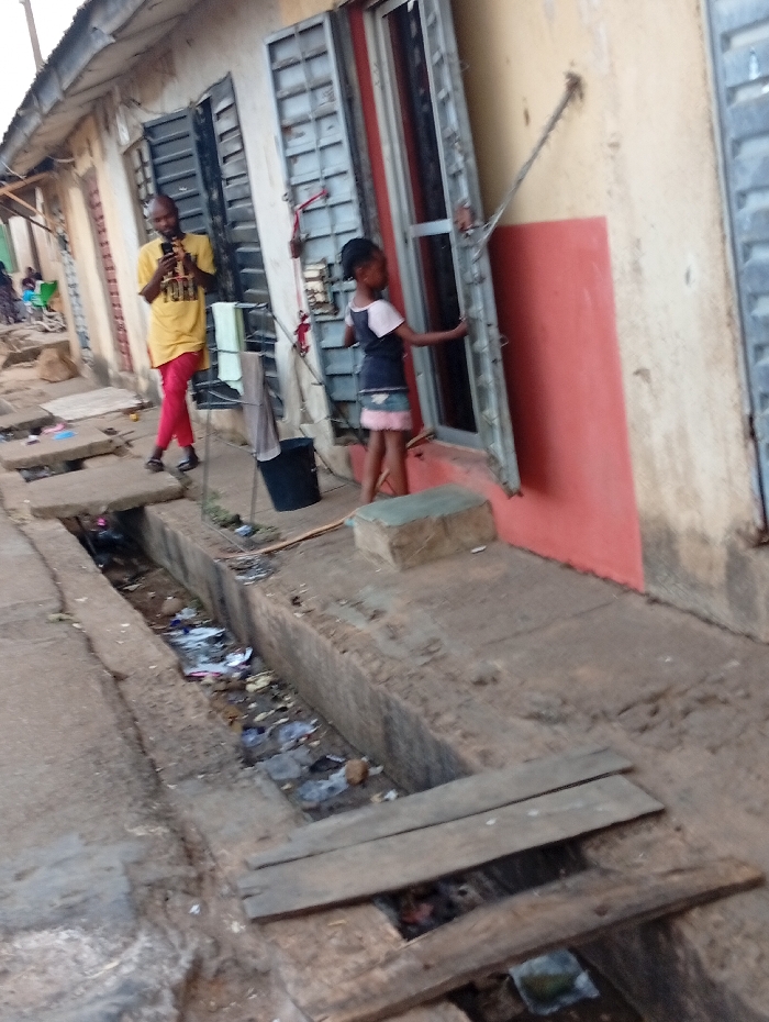 A girl opens a metal-framed window against a building with peeling paint. A man stands nearby looking at a phone. Trash fills a ditch running along a concrete walkway. Two wooden planks bridge the ditch. The building's paint is peeling, and a section is painted reddish-orange. Laundry hangs nearby. A black bucket sits on a concrete surface. The area appears run-down with visible litter.