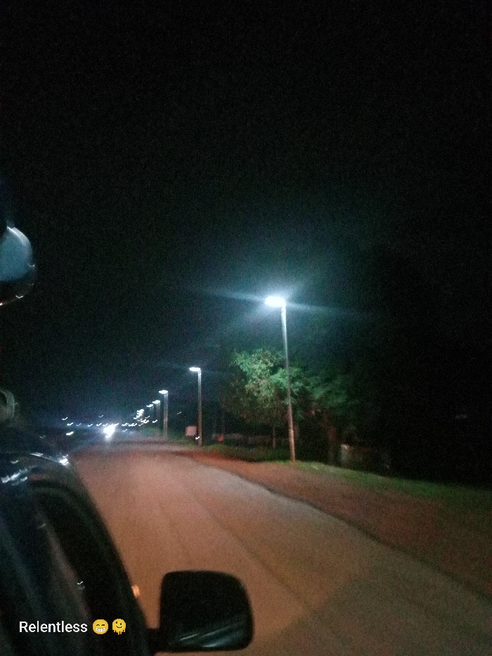 The image depicts a nighttime scene from the interior of a vehicle, looking forward and slightly to the right, in an unspecified urban or suburban area. The foreground on the lower-left shows the dark-colored exterior of the vehicle, including a rectangular side-view mirror with a black casing. A paved road, appearing wet or reflective, extends into the distance, illuminated by a series of pole-mounted streetlights with cool-toned white light positioned along the right side. The light from these fixtures creates distinct cones of illumination on the road and illuminates the green foliage of trees and bushes lining the right shoulder. Distant, blurred vehicle headlights are visible further down the road, indicating other traffic or parked vehicles. The sky above is dark and featureless. No people are visible. The word "Relentless" followed by a grinning face emoji and a drooling face emoji is overlaid in the lower-left corner of the image.