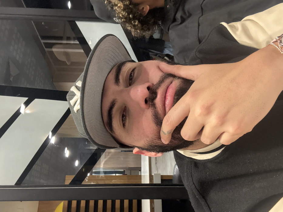 A bearded man wearing a New York Yankees baseball cap touches his face. He has brown eyes and dark hair. The background features a window or glass partition with reflections and black bars. Part of another person with curly hair is visible in the upper part of the frame. The man is wearing a black and white jacket.