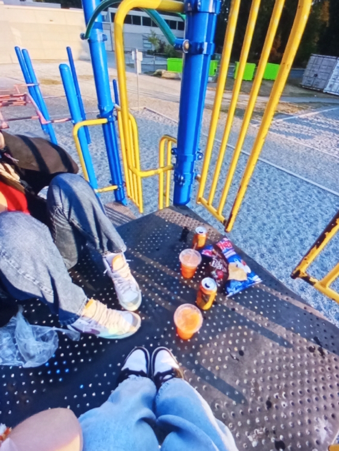 Three individuals are observed on a perforated dark grey metal platform of a playground structure in Aktash, Uzbekistan. The platform is supported by bright blue vertical poles and yellow horizontal and diagonal bars. The foreground individual wears light blue jeans and black and white athletic shoes, with feet together. To their left, another individual wears dark blue jeans and light-colored athletic shoes with multi-colored soles, with legs extended and crossed at the ankles. A third individual's lower legs and light-colored athletic shoes are partially visible behind the second individual. Arranged on the platform are four clear plastic cups containing an orange-colored beverage, two aluminum beverage cans (one orange-gold, one silver-red-orange), and an open blue bag of Lays potato chips. A crumpled clear plastic bag is also present. In the background, a light-colored building with multiple windows is visible under a clear sky. The ground surrounding the playground appears to be gravel or crushed stone. Three green dumpsters and two large grey metal containers are situated in the middle ground. Sunlight casts shadows on the platform, indicating an outdoor, daytime scene.