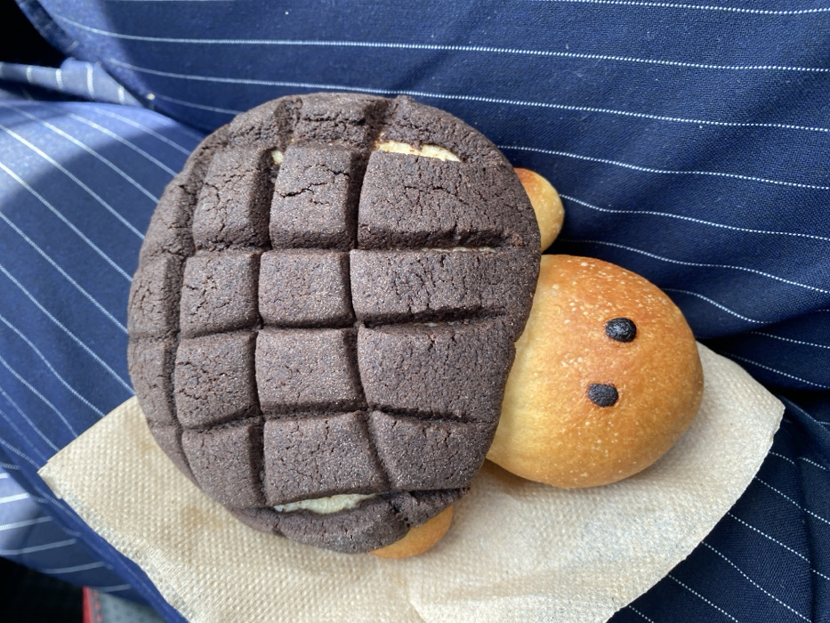 A single turtle-shaped "concha" pastry is centrally positioned in a close-up, high-angle view