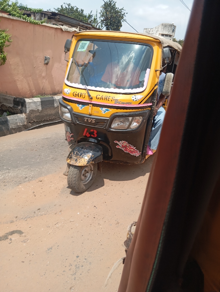 An outdoor daylight scene in Onitsha, Nigeria, depicts a yellow and black TVS brand tricycle (locally known as a Keke Napep) on a road