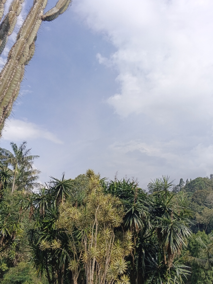 The scene depicts a natural landscape in Laclubar, East Timor, under a bright sky with scattered white clouds. The upper half of the frame is dominated by a light blue sky. On the far left, a large, vertically oriented, ribbed cactus-like plant, light green with dark spines, extends from the bottom edge upwards, partially cropped. The lower half of the image features dense vegetation, including multiple palm trees with visible fronds, particularly on the left, and numerous plants with stiff, rosette-forming leaves, resembling Agave or Yucca species, appearing in varying shades of green and yellowish-green. Further back, a dense canopy of dark green trees and shrubs forms a continuous hillside. No individuals, animals, man-made structures, or specific actions are visible.