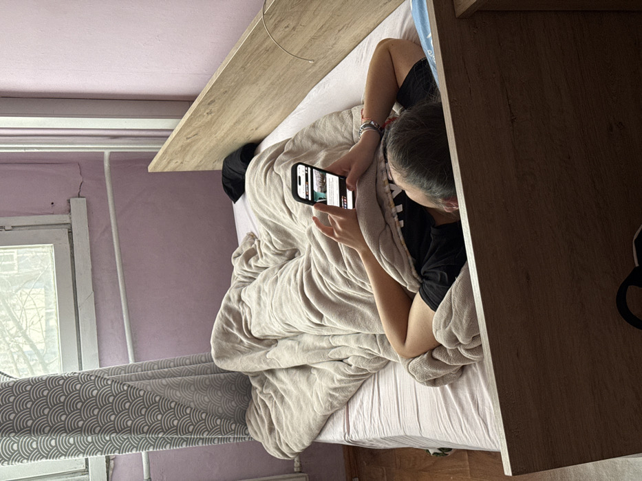 An individual is depicted lying supine on a single bed, viewed from behind the head and upper torso. The person has dark hair and wears a black short-sleeved top. Both hands hold a black smartphone vertically, with thumbs engaged in interacting with the illuminated screen, which displays what appears to be a news article or social media feed with text and images. Several bracelets, including red, white, and dark bands, are visible on the individual's right wrist. The person is partially covered by a large, light beige/tan colored plush blanket, which also covers most of the bed. A light-colored fitted sheet is visible on the bed, along with a blue-accented pillow under the individual's head. The bed features a light wood grain headboard and frame. Behind the bed, a wall painted in a light purple or lilac hue exhibits minor cracks and paint imperfections, particularly near the window frame. A white-framed window is visible to the left, through which bare tree branches and parts of a distant building are discernible, suggesting an urban or suburban setting. A grey curtain with a repeating wave or scallop pattern hangs on the left side of the window. A white horizontal pipe or radiator element is affixed to the wall below the window. A black fabric object, possibly a folded garment or cap, rests on the bed near the right side of the headboard. The floor in the lower left foreground is light-colored wood. No specific visual information within the image allows for the identification of a precise location within Sofia, Bulgaria.