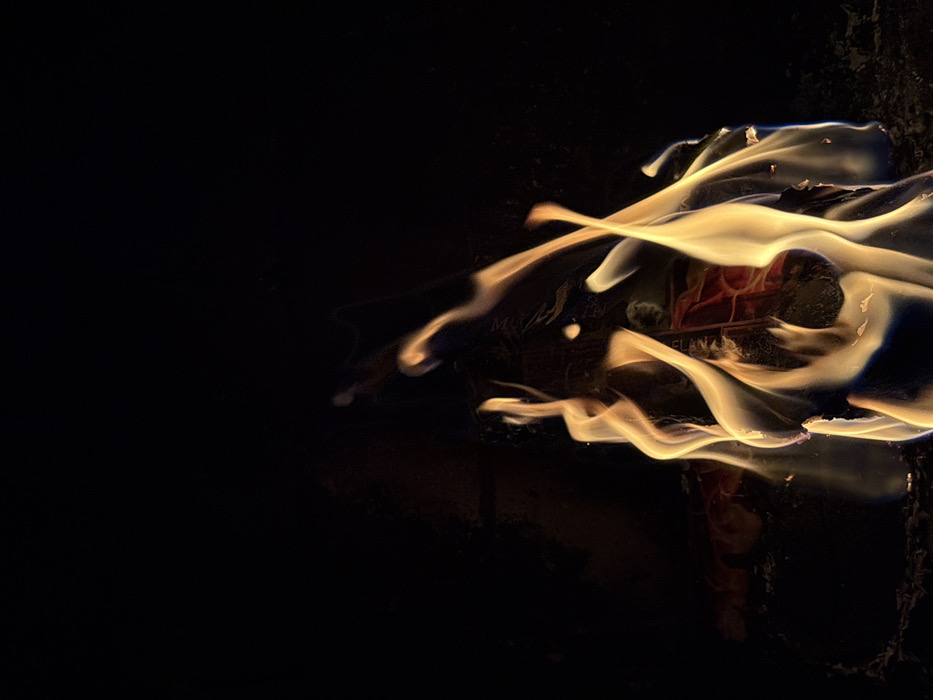 A dramatic composition unfolds in contrasting light and shadow. Wisps of golden flames dance across the right side, their fluid forms interweaving. Beneath the fire, a glimpse of red hints at burning material. A blackened surface frames the fiery spectacle. The left portion is dominated by stark darkness, heightening the intensity of the illuminated section.