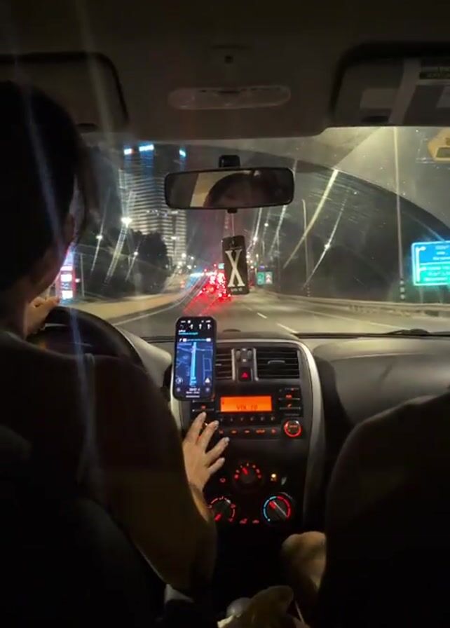 inside of a car driving at night, presumably on a highway due to the visible city lights and other cars. The driver, a person with short dark hair, is operating the vehicle with a passenger in the front seat. A smartphone is mounted on the dashboard displaying a navigation app. The car's radio is turned on and playing music. A black and white "X" decoration hangs from the rearview mirror. The video is taken from the perspective of someone sitting in the back seat. The overall setting is a nighttime urban driving scene.