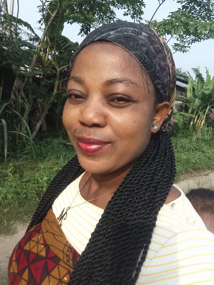 A woman with dark hair braided down her chest smiles softly at the camera. She wears a patterned headscarf, a striped shirt, and a large pendant on a gold chain. Behind her, dense green foliage fills the background, including banana trees. A small portion of another person's head is visible at the bottom right corner of the frame.