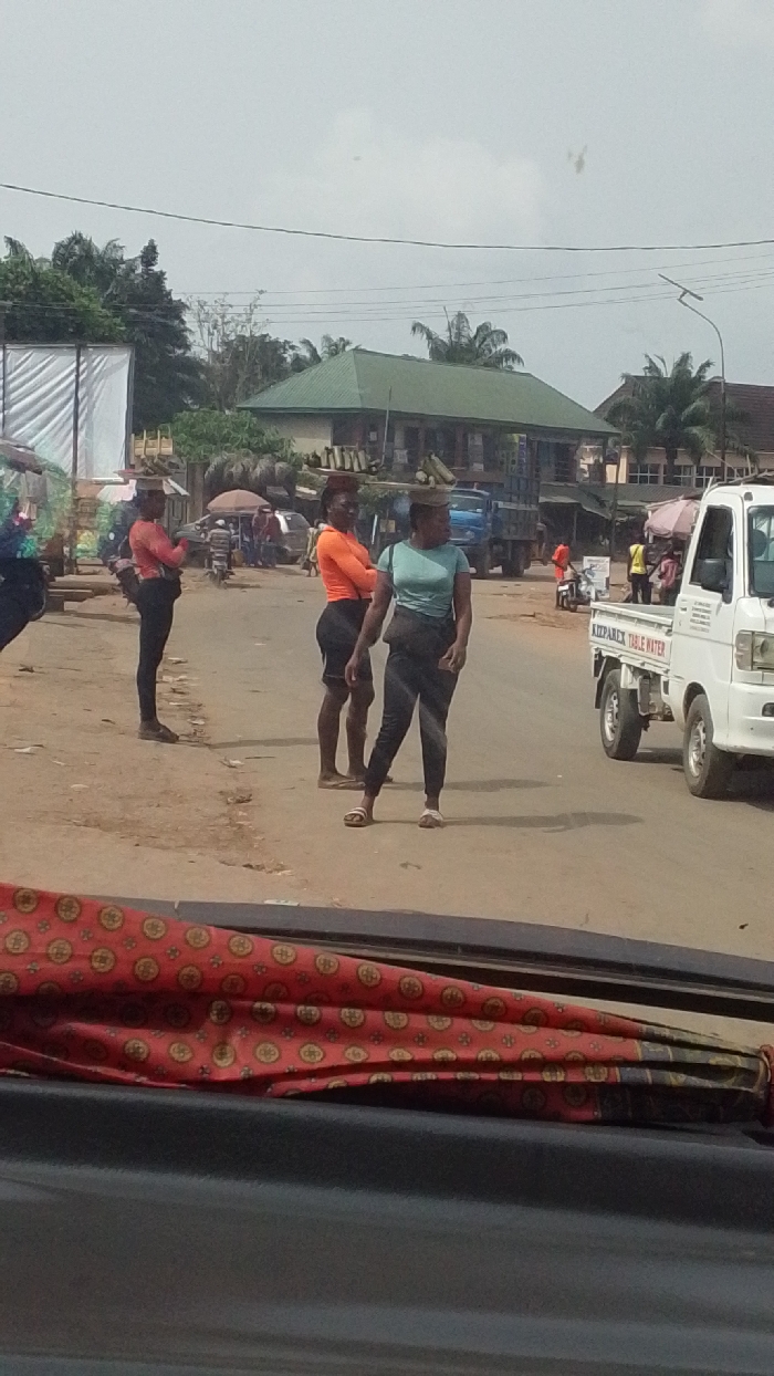 This image depicts a daylight street scene in Igbo Ukwu, Nigeria. The perspective is from inside a vehicle looking out onto a roadside environment. **People:** Three adult females are prominently positioned in the mid-ground, standing near the unpaved edge of a road. The leftmost female wears an orange long-sleeved shirt and black trousers, carrying an unidentified flat object on her head, and stands with arms crossed, facing right. The central female wears an orange short-sleeved top and black shorts, carrying a woven, light-colored bundle or basket on her head, and stands with arms crossed, facing left, wearing light-colored open-toed sandals. The rightmost female wears a light blue short-sleeved top and black trousers, also carrying a woven, light-colored bundle or basket on her head, with a dark bag slung diagonally across her body. She stands facing slightly left, looking right, and wears light-colored open-toed sandals. Additional individuals are visible in the background, including one person in a yellow vest near a vehicle and others near motorbikes and market stalls. **Objects:** A white pickup truck, marked "KIZPAREX TABLE WATER" and displaying a partial phone number, is positioned on the right side of the road, facing left. A blue truck is visible in the distant background on the left. Power lines extend horizontally across the upper frame, and a street light pole is present on the right. The bottom of the frame reveals a partial view of a red patterned fabric and a black surface, consistent with a vehicle's interior. **Environment:** The street features both unpaved and paved sections. Buildings with varying roof styles, including one with a green sloped roof, line the street. Numerous green trees and palm trees are interspersed throughout the background. The sky is overcast and grey.