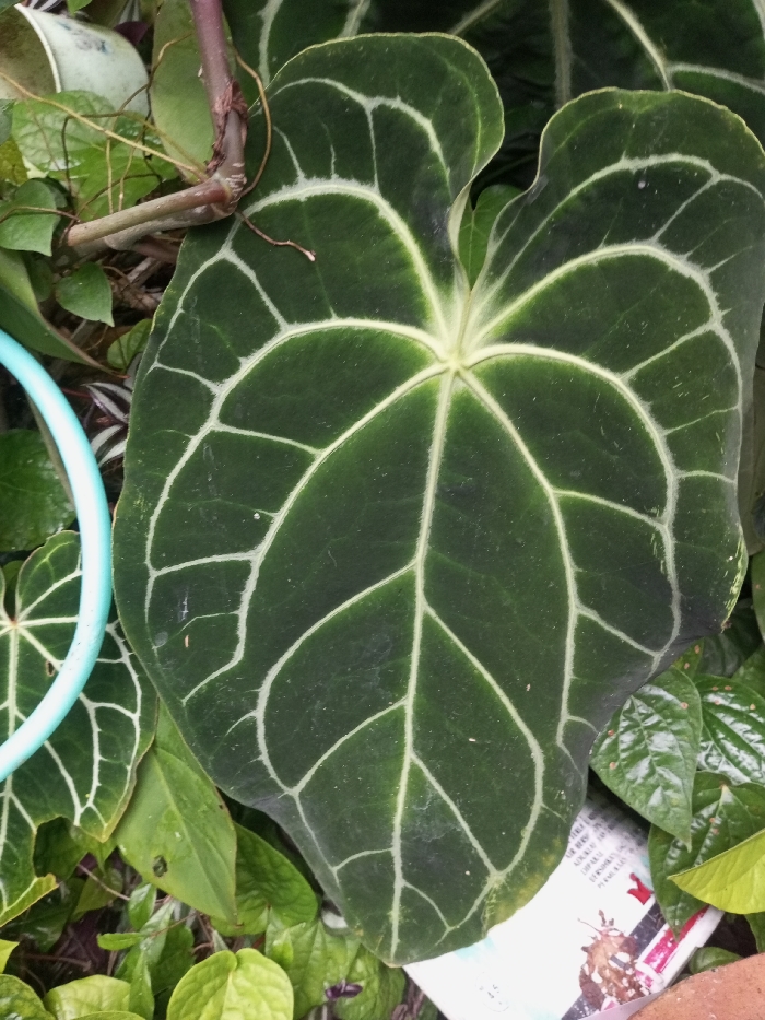 The scene depicts a close-up, high-angle view of dense plant foliage. Dominating the center is a large, dark green, heart-shaped leaf with prominent, raised white venation forming a distinct, web-like pattern. Its surface exhibits a slightly textured or velvety appearance. Surrounding this central leaf are numerous other green leaves of varying shades and forms, indicating a densely planted environment. A reddish-brown stem extends from the upper left, partially overlapping the central leaf. To the left, a segment of a light blue, curved plastic object, possibly a hose or ring, is visible amongst the greenery. In the lower right quadrant, a piece of white paper with black text and an image of a brown insect (resembling a butterfly or moth) is partially obscured by leaves. A red, white, and blue pattern is also discernible on the paper. A small fragment of a terracotta-colored object is visible at the extreme bottom right. No individuals are present, and no actions or interactions are depicted beyond the static arrangement of objects and plant growth. The environment appears to be a lush garden or plant cultivation area. The specific location in Pandaria, India, is not identifiable from the image.