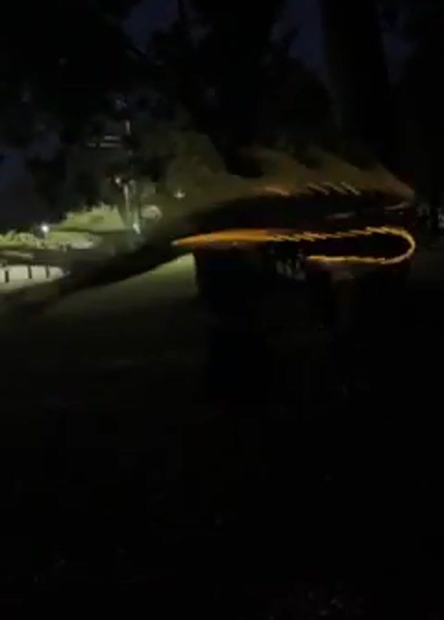 At night, an individual is spinning a glowing ring in a park-like setting. The person is in the foreground, with other figures visible in the background. Trees surround the area. The ground appears to be grassy. There are street lights illuminating the background and some vehicles can be seen in the distance.