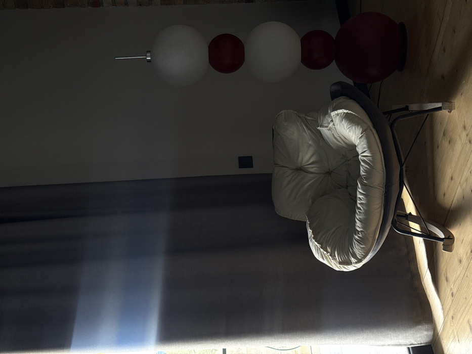 This image depicts an interior scene in the city of Dilijan, Armenia. The environment is an indoor room with light-colored wooden flooring and off-white walls. On the left, a large window is partially covered by a dark grey, floor-length curtain. Sunlight penetrates the room from the left, illuminating a section of the curtain and the wooden floor in front of it, casting distinct shadows. Centrally positioned is a modern rocking chair featuring a dark-colored frame and a large, light beige or off-white tufted cushion. To the right of the chair, a tall, decorative floor lamp stands. This lamp is composed of a vertical stack of alternating white and dark red spherical elements, capped with a metallic finial. No individuals are present, and no discernible actions or interactions are occurring within the visible frame. A dark square object, possibly an electrical outlet or switch, is mounted on the wall between the curtain and the floor lamp.
