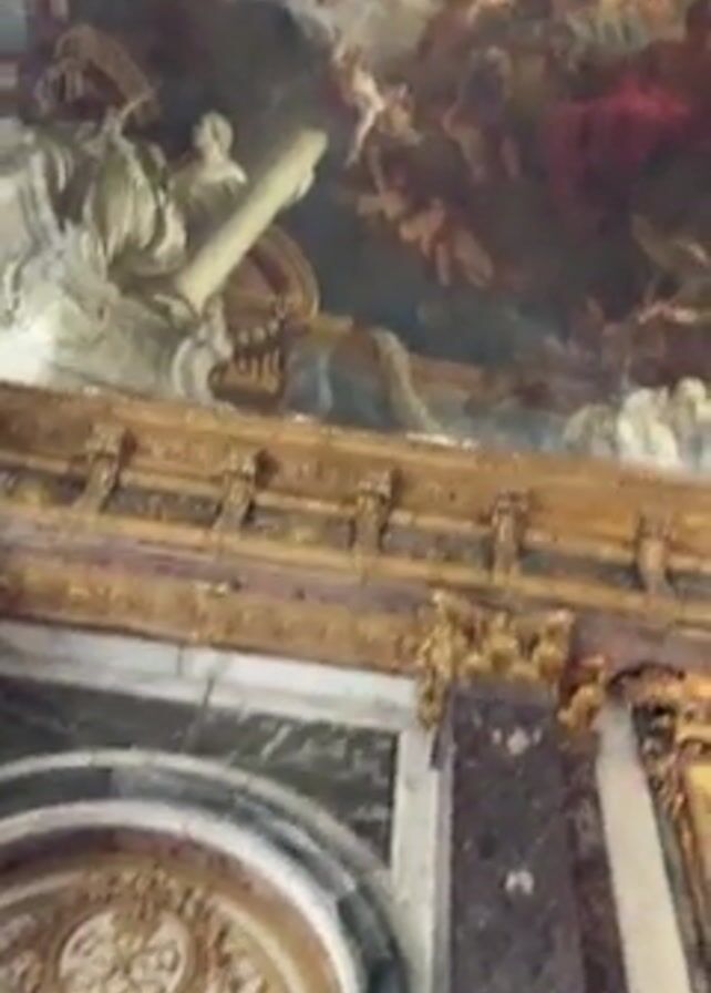 n upward view of an ornate ceiling painting within an elaborately decorated building, potentially a palace or museum. The painting is a classical-style fresco depicting numerous figures, including cherubs, deities, and human-like characters in a cloud-filled sky. The colors are predominantly soft pastels with bursts of red, blue, and gold. Below the painting is an ornate gold-trimmed border and a marble arched doorway with additional gold detailing. The camera slowly pans upwards, focusing on the details of the ceiling painting.